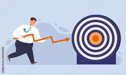 Business man holding grown graph arrow and running to target archery. Concept of goal achievement, successful business, hard working for goal, aim mission challenge task. Flat vector illustration.