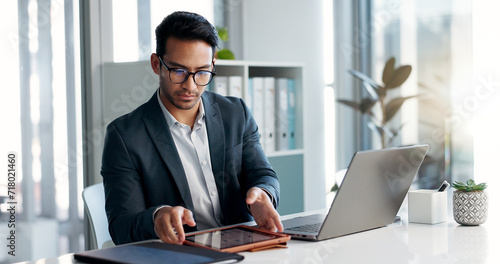Business man, laptop and tablet for data analytics, stock market and online research for profit, sales or company account. Asian trader, investor or analyst in office on digital tech and computer