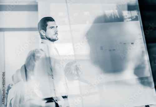 Business man making a presentation in front of whiteboard. Business executive delivering a presentation to his colleagues during meeting or in-house business training. View through glass.