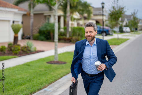 Business man run near house in american neighborhood. Businessman run down street, late for a meeting. Businessman in suit run be success. Running business man. Fast business. Run and late business.