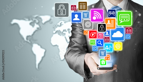 Business man using smart phone with social media icon set