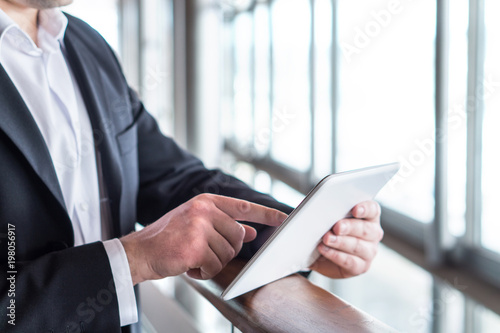 Business man using tablet by the window in modern glass office building. Businessman holding smart mobile device and working. Pressing touch screen with one finger.