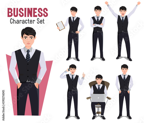 Business man vector characters set. Businessman character in white background with standing, working and celebrating pose and gestures for employee male cartoon design. Vector illustration.
