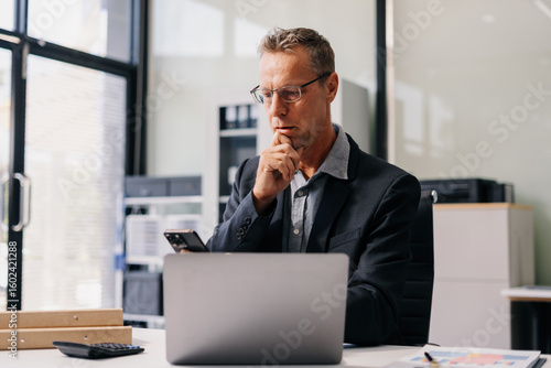 Business man working at office with laptop and documents on desk, financial adviser analyzing data.