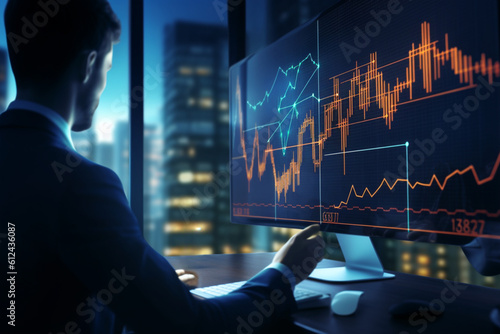 Business Man Working Late Analyzing Stock Market Chart Graph