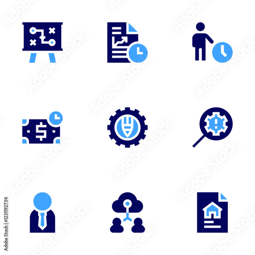 Business management icon set. Bold style. Duotone colors. identify, loan, time is money, time management, management, strategy, businessman, team