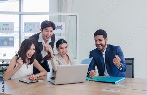 Business manager employee teamwork asian group meeting presentation look holding document computer on desk labtop talk project creative plan ready for happy work marketing online sale in room office