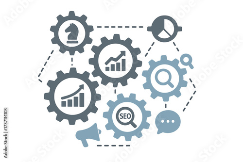 Business mechanism and digital marketing concept. Abstract illustration with connected gears and icons for strategy, service, analytics, research, SEO, growth and communication.