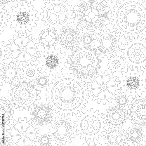 Business mechanism concept. Abstract background with connected gears and icons for strategy, service, analytics, research, seo, digital marketing, communicate concepts. Vector seamless pattern