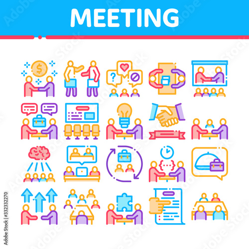 Business Meeting Conference Collection Icons Set Vector. Business Meeting And Seminar, Businessman Partnership, Communication And Talking Concept Linear Pictograms. Color Illustrations