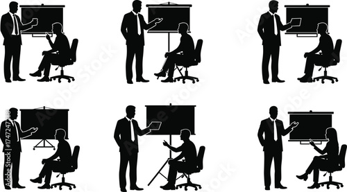 Business meeting presentation silhouette illustration, teamwork discussion with boss and employee in office workplace vector design