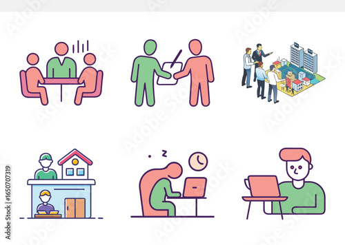 Business Meeting, Real Estate, and Work Icon Set