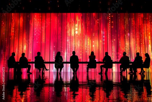 Business Meeting Silhouettes Against Futuristic Red Digital Background - Conference Presentation Design