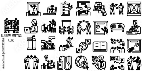 Business meeting simple concept 28 icons set. Related team, teamwork, co-workers, cooperation. Linear busines simple symbol collection. vector illustration.
