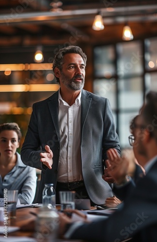 Business meeting with presenter standing at table, attendees listening and taking notes in an office