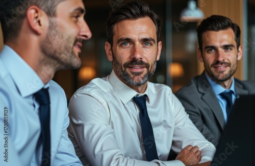 Business meeting with three male colleagues in formal attire engaging in discussion in a modern office setting