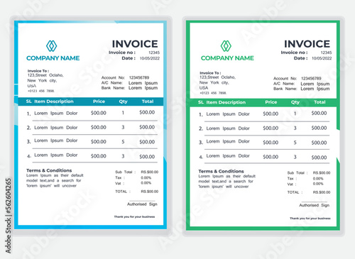Business Minimal Corporate Invoice design template vector illustration bill form price . Creative template and stationery design payment agreement design template Cash Memo, Vector Quotation Design