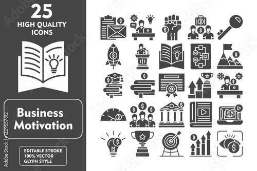 Business Motivation glyph editable icon set. Containing corporate identity, books, tutorials, online course, creativity, trophy, target, growth and more. Vector illustration icons