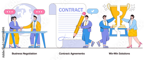 Business negotiation, contract agreements, win-win solutions concept with character. Negotiation skills abstract vector illustration set. Deal-making, conflict resolution, collaborative agreements