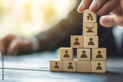 Business network and team management concept with connected human icons on wooden blocks and an upward arrow in a flat lay