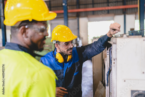 Business of factory production and construction work technology, Professional engineer person wearing safety helmet hard hat to using machinery equipment of industry facility in manufacturing plant
