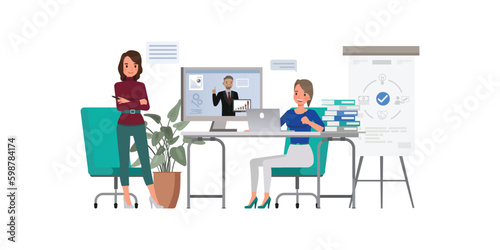 Business online course concept. Office man and woman character vector design. Business people working in office planning, thinking and economic analysis.