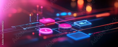 Business operations flowchart, interactive display, futuristic look, 3D illustration