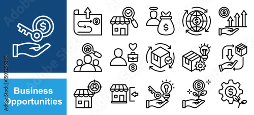 Business opportunities icon collection set. Containing entrepreneurship, innovation, investment, venture, profitability, market research, strategic planning icon. Simple line vector.