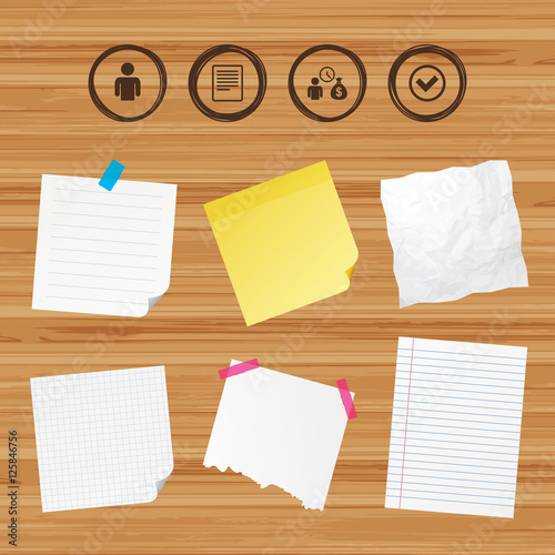 Business paper banners with notes. Bank loans icons. Cash money bag symbol. Apply for credit sign. Check or Tick mark. Sticky colorful tape. Vector