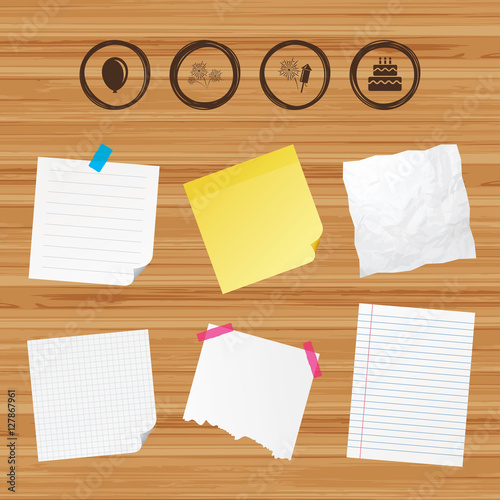 Business paper banners with notes. Birthday party icons. Cake and gift box signs. Air balloon and fireworks symbol. Sticky colorful tape. Vector