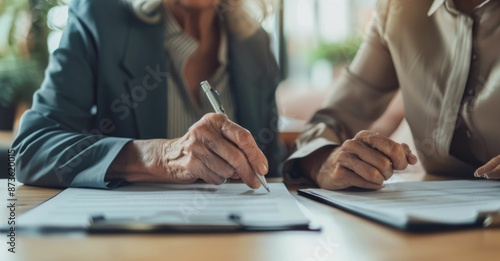 Business partners finalizing legal documents during a meeting at the office table with pen and paper