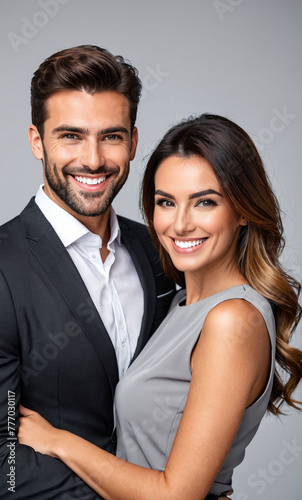 Business partners posing in front of gray background