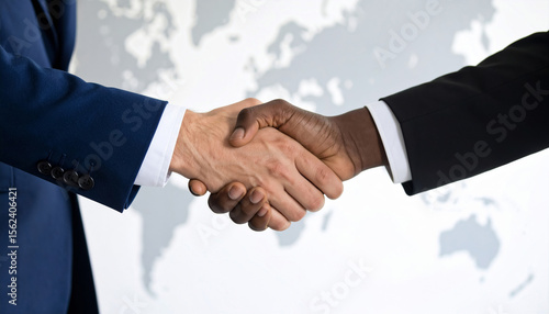 Business partners shaking hands in front of a world map