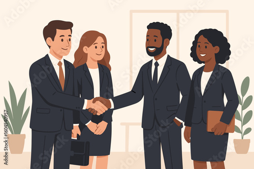 Business partnership handshake. Diverse teams making a deal and agreement in the office. Corporate collaboration and success. Working together concept. Vector illustration.