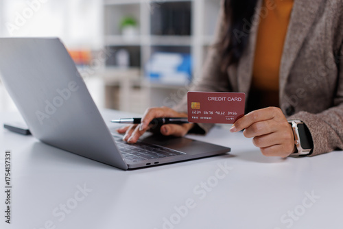 Business Payment banking, business woman hand on laptop making electronic payments with a credit card. Online shopping or tax payment concept