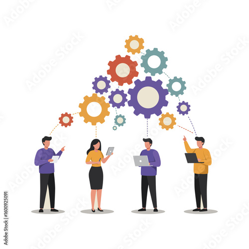 Business people and a businessman with gears and social network icons symbolize teamwork, technology, and communication for success