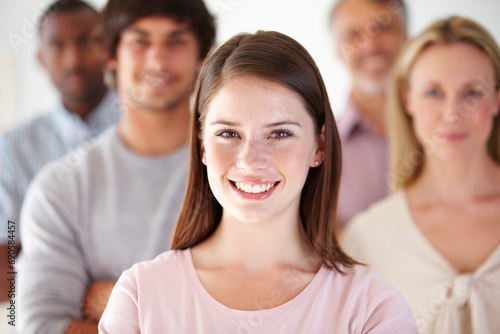 Business, people and portrait in office with support, solidarity and entrepreneurship, trust or faith. Leadership, face and happy woman with team for partnership, solidarity or diversity at startup