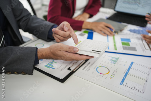 Business people are working together in the office, using a calculator and reviewing financial documents, focusing on investment strategy for a new project