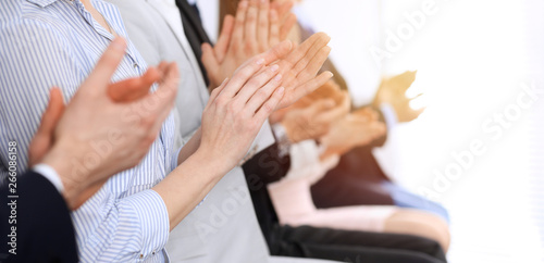 Business people clapping and applause at meeting or conference, close-up of hands. Group of unknown businessmen and women in modern white office. Success teamwork or corporate coaching concept