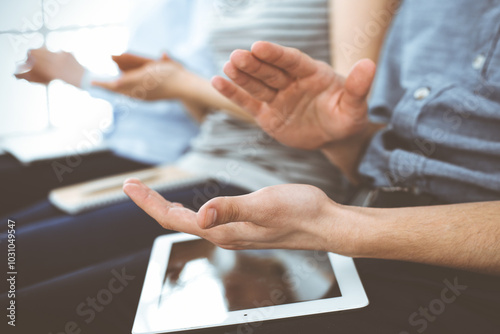 Business people clapping at meeting or conference, close-up of hands. Group of unknown businessmen and women in modern white office. Success teamwork, corporate coaching and applause concept