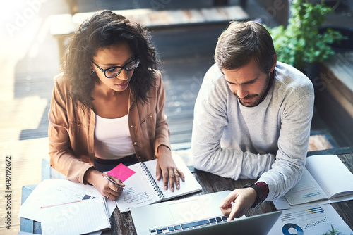 Business people, collaboration and laptop in meeting at cafe with top view, discussion and remote work. Teamwork, data analysis and designers with brainstorming, creative ideas and infographics