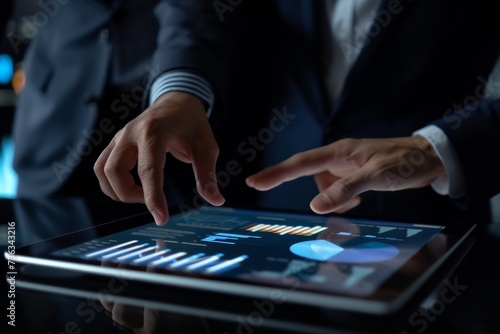 Business people, data analysis with tablet and paperwork, hands with online review in meeting and team with market research. Statistics, analytics dashboard and digital infographic with collaboration