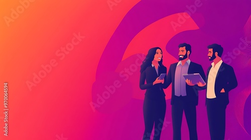Business people discussing ideas with digital tablet and smartphone in front of gradient background.