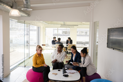 Business people discussing paperwork in relax zone