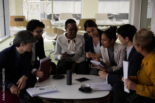 Business people discussing paperwork in relax zone