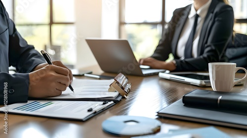 Business People in a Meeting Room with Laptops and Documents: Focus on Woman's Hand Writing Notes on Paper. Business Concept for Project Planning or Real Estate with Home Model, 8K Photorealistic, Cin