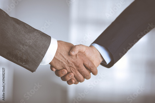 Business people in office suits standing and shaking hands, close-up. Business communication concept. Handshake and marketing