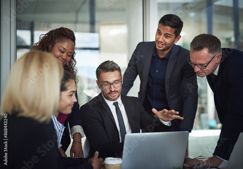 Business people, lawyer and laptop in meeting for teamwork, legal solution and collaboration at law firm. Talking, leadership or attorneys in discussion for feedback, planning or project in corporate