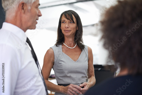 Business people, meeting and happy for discussion, leadership and ceo or boss with speech of company values. Professional lawyers, team and senior man speaking of law firm objectives and planning