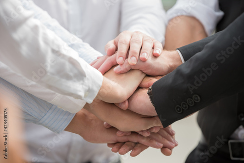 Business people putting their hands together, business startup , diverse team , happy teamwork concept.